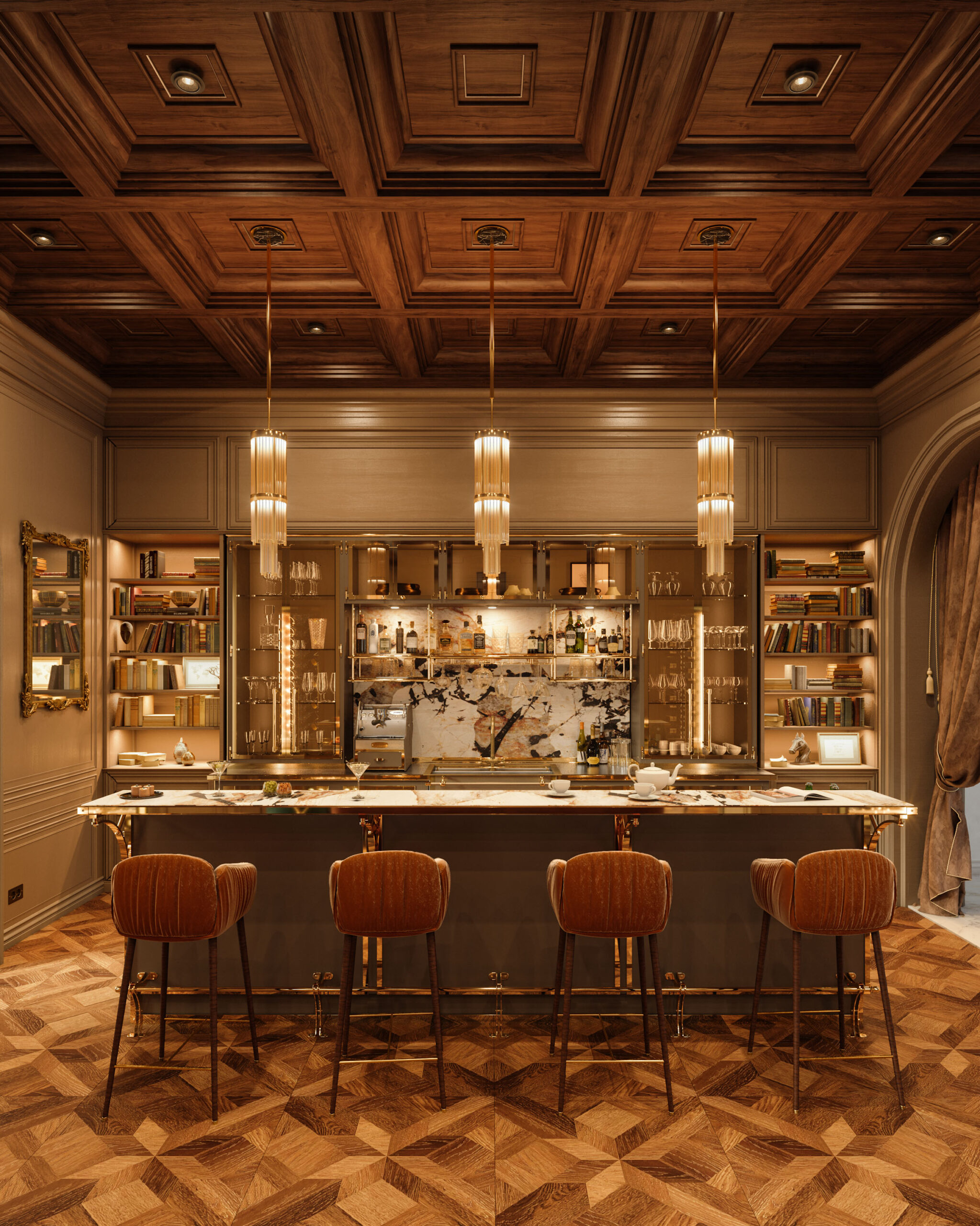 On the upper floor of a Paris penthouse, Officine Gullo designs a lounge bar conceived as a private hideaway. A wall over four meters long with glass display cases and functional zones defines the space, while the three-and-a-half-meter bar island, with a built-in cocktail station beneath the floating countertop, becomes its centrepiece.