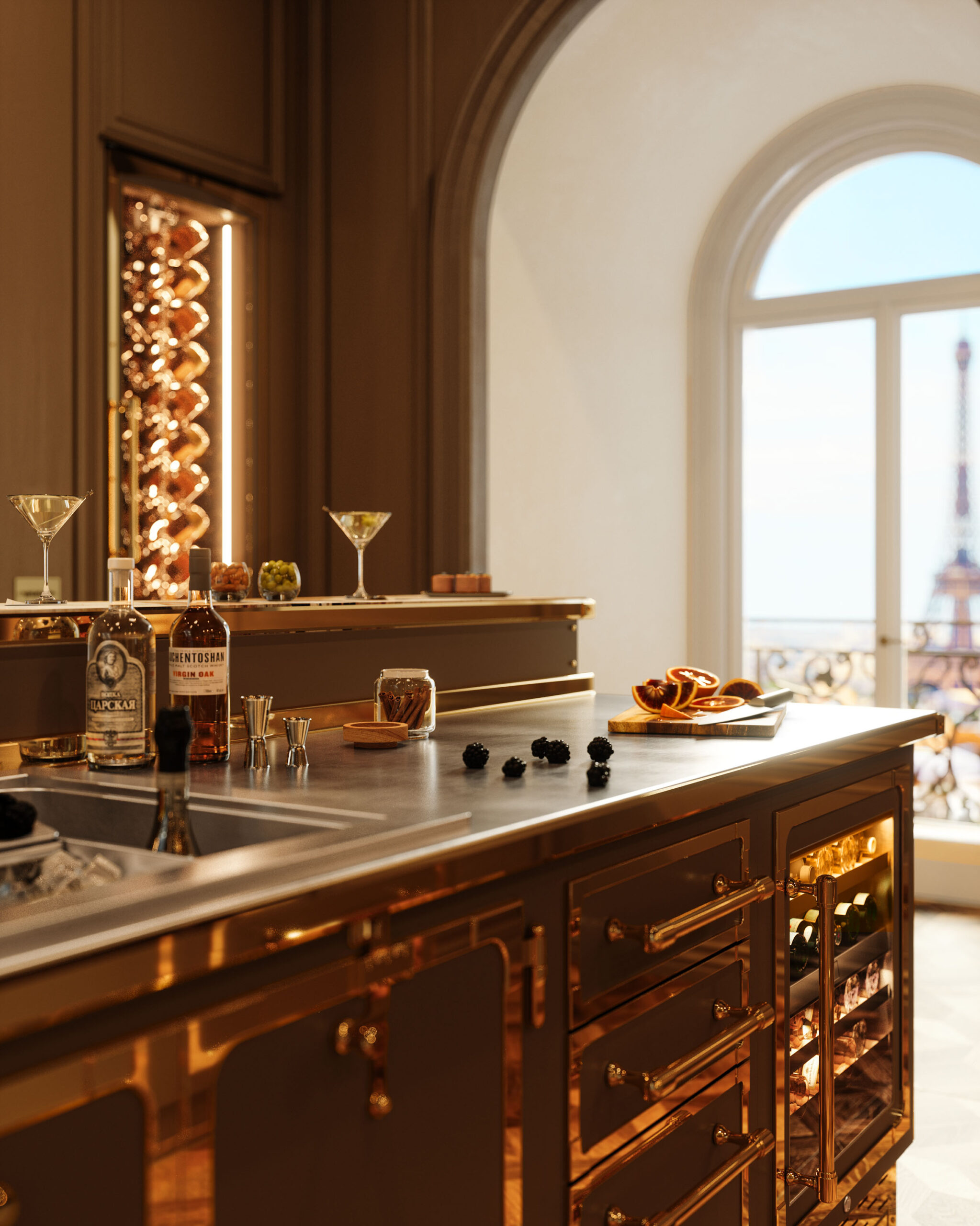 Two under-counter wine fridges, a matching coffee machine, and inlaid oak flooring complete an environment created to enhance Parisian evenings with impeccable style.