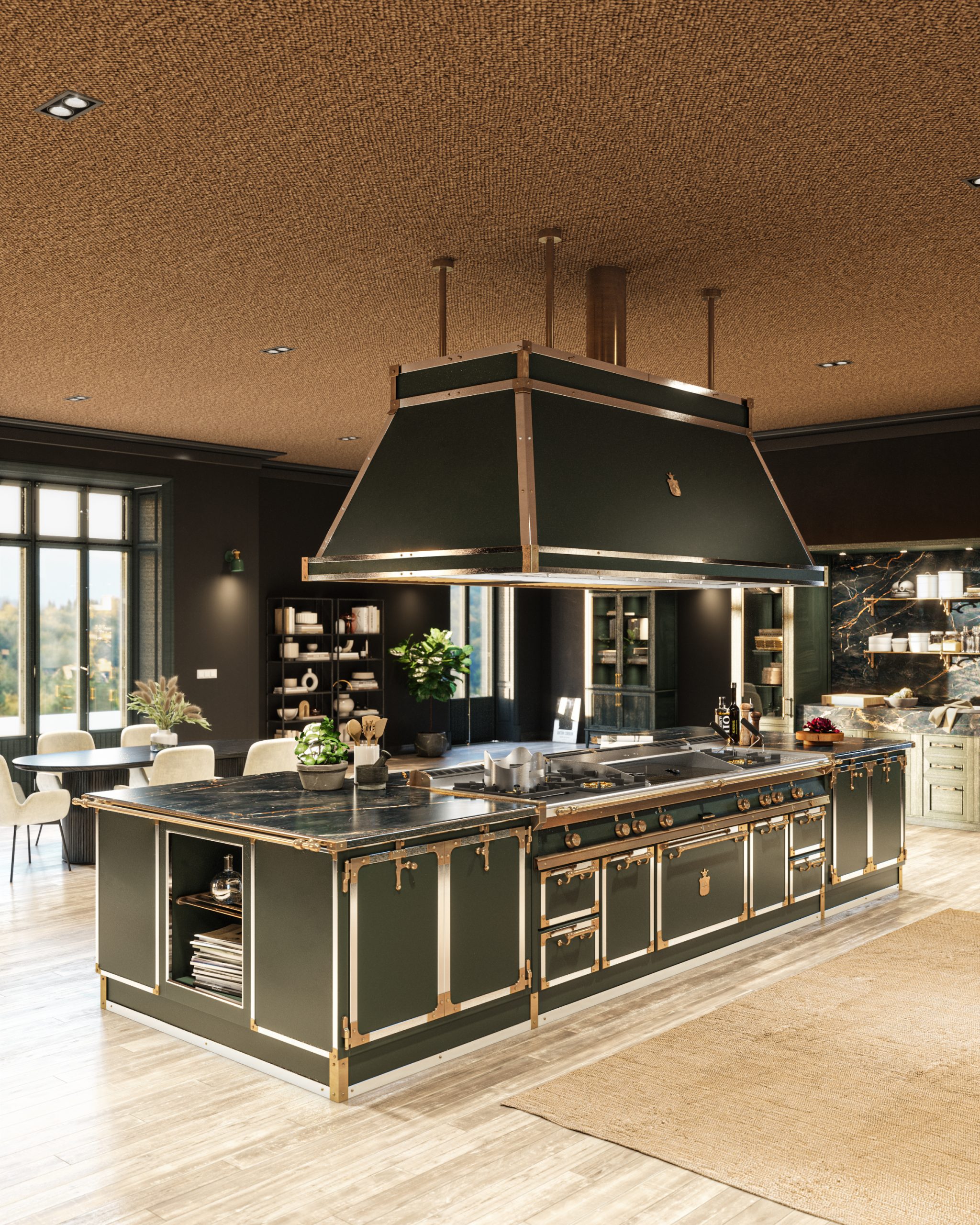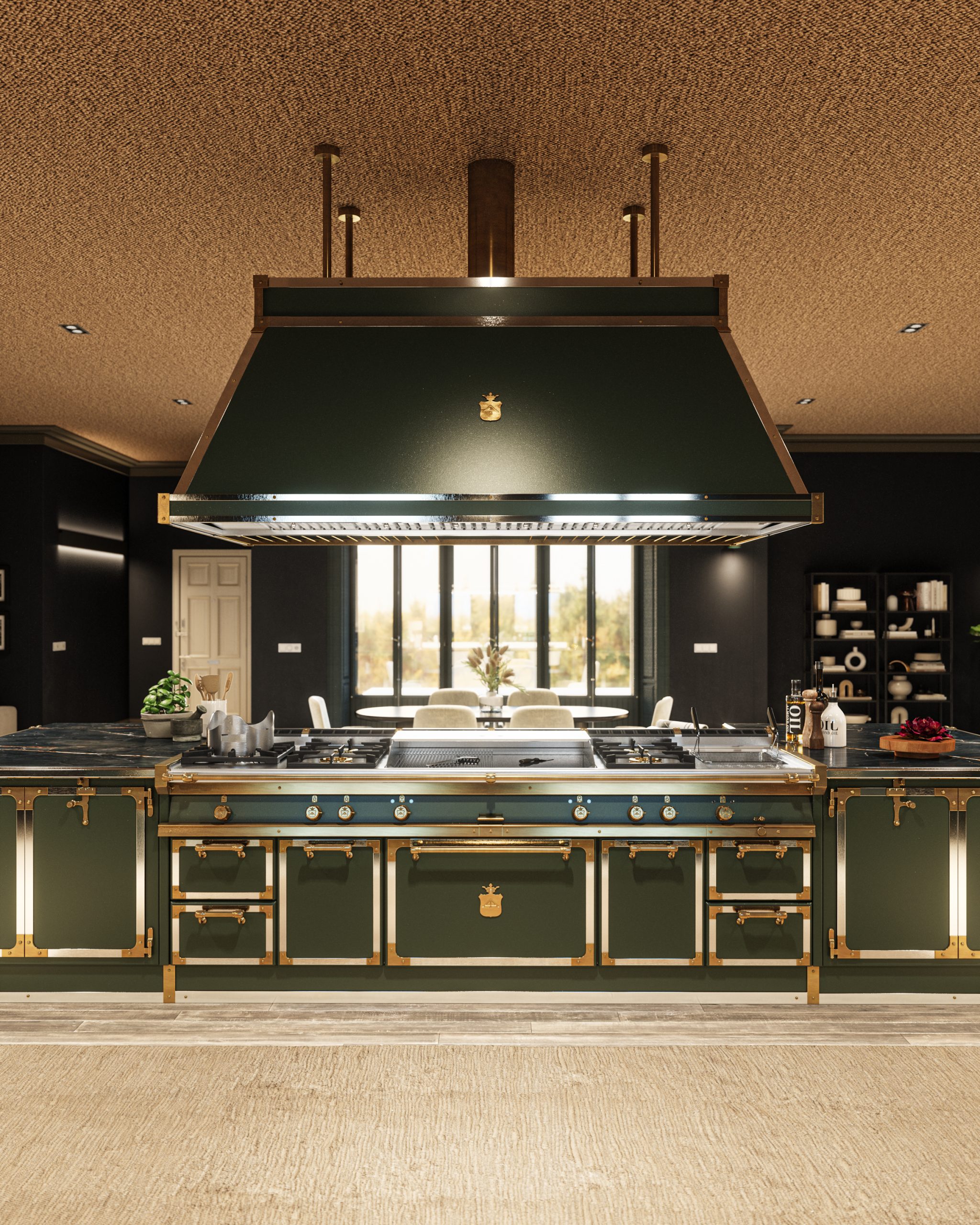 A stunning Tailor Made island created to be the focal point of this space, featuring dark colors and elegant details: an island that stands out majestically in the center of the room. The design of the Shine Black Stone used for the worktop pairs beautifully with the dark green shade chosen to paint the cooker. The island consists of an area dedicated to different types of cooking, with gas burners, a wok cooktop, a pasta cooker and a frytop, as well as a food prep area. To finish the project, along the wall is a washing area, also featuring the same marble top that picks up the tones of the island and completes its function.