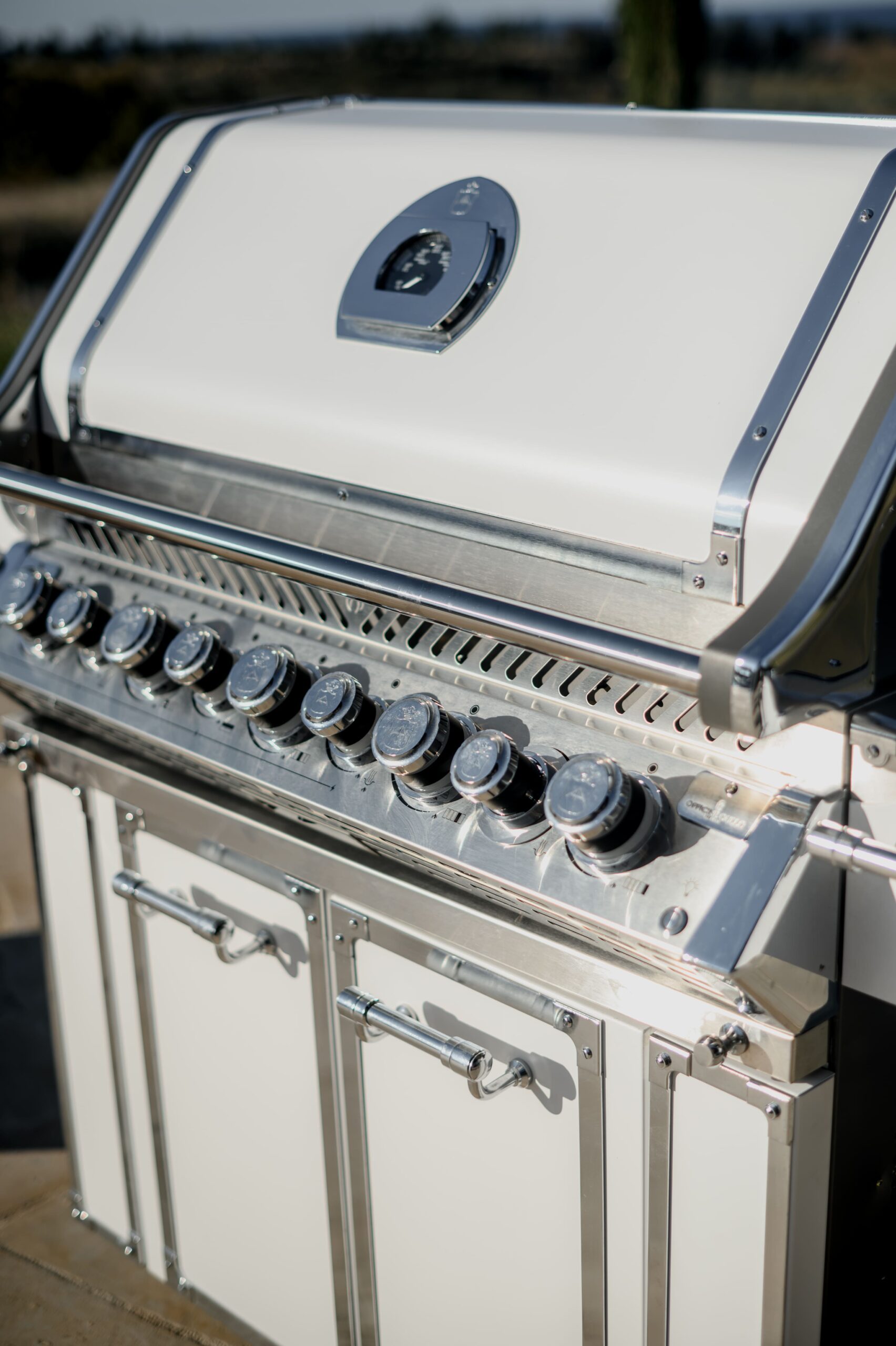 OG Professional 100 freestanding barbecue with eight 31 kW burners and 9.5 mm stainless steel grills; double-drawer refrigerator; wine cooler; welded sink with arched faucet; dual sizzle zone grills; ice bin; large storage modules.