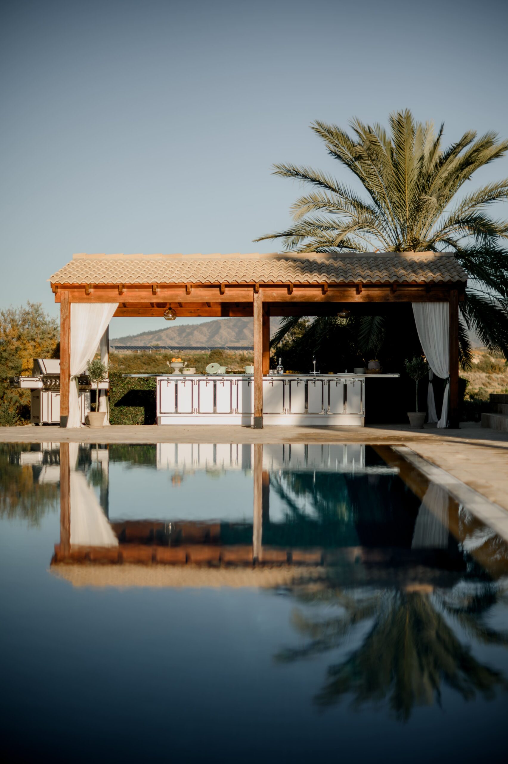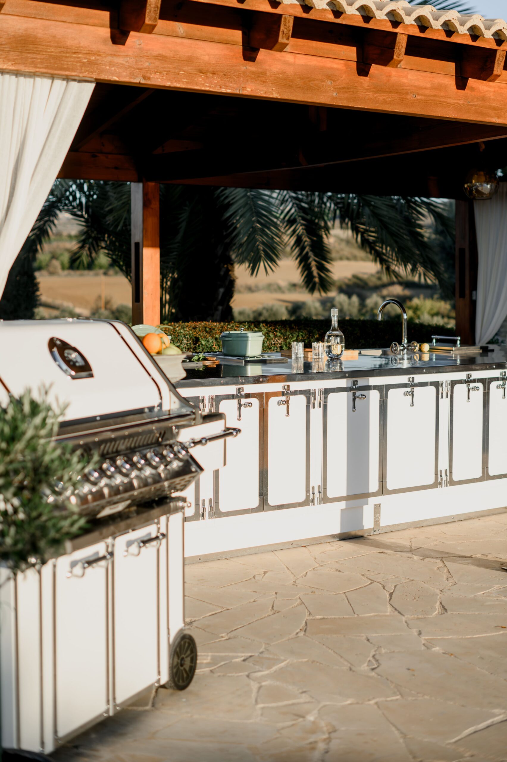 Positioned beneath a natural wood pergola and overlooking the pool, the kitchen is crafted entirely from AISI 316 stainless steel with a matte Lily White finish. Satin chrome accents and polished chrome fixtures complete the elegant, weather-resistant composition.