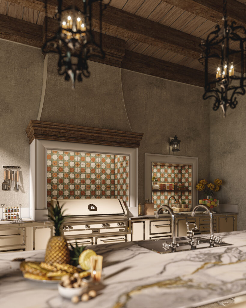 These settings for conviviality and haute cuisine are designed to become the heart of your home’s outdoor space, where you can gather in the morning to have breakfast, prepare a delicious lunch with the finest professional cooking appliances, cool off after a swim with cocktails by the pool, and enjoy a relaxing aperitivo as you wait for guests to savor a gourmet dinner under the stars.