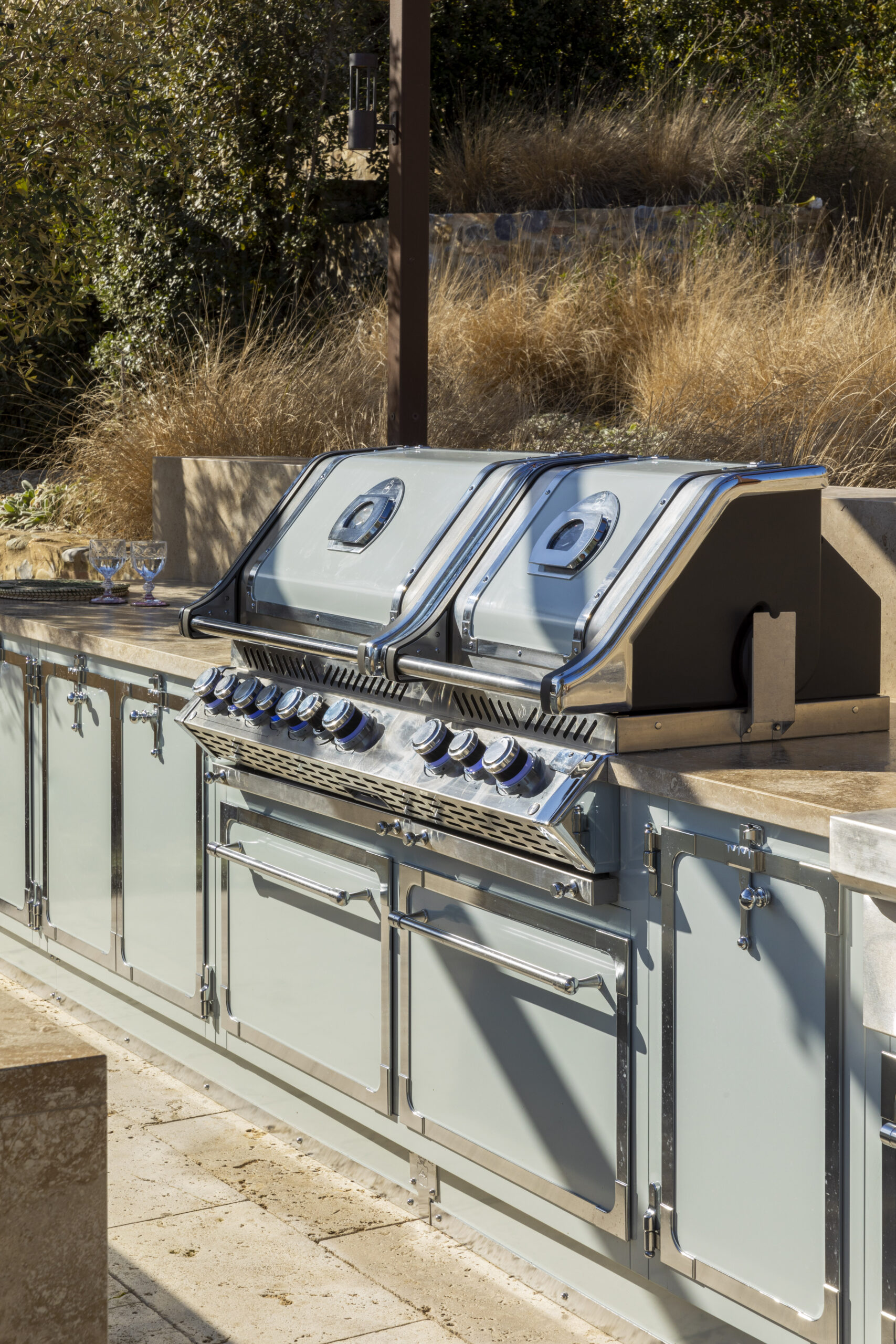 Double professional barbecue with lid; double sizzle zone burners; integrated sink with dual arched chrome faucets; spacious storage modules with drawers and sage-green painted steel doors.