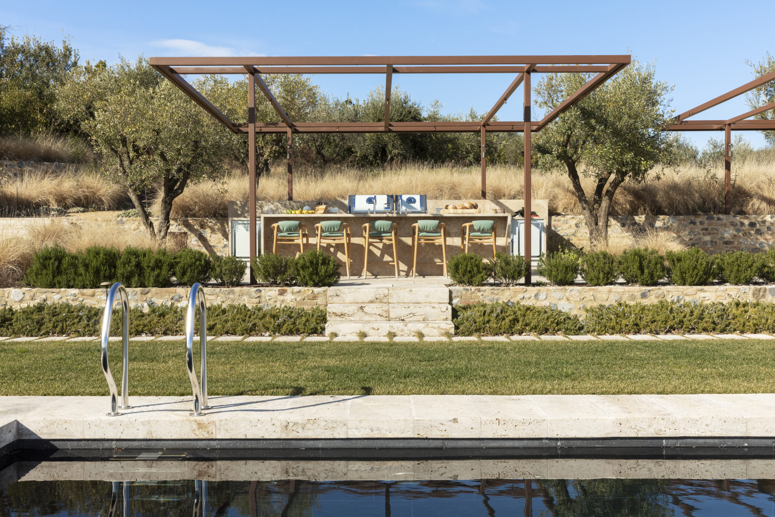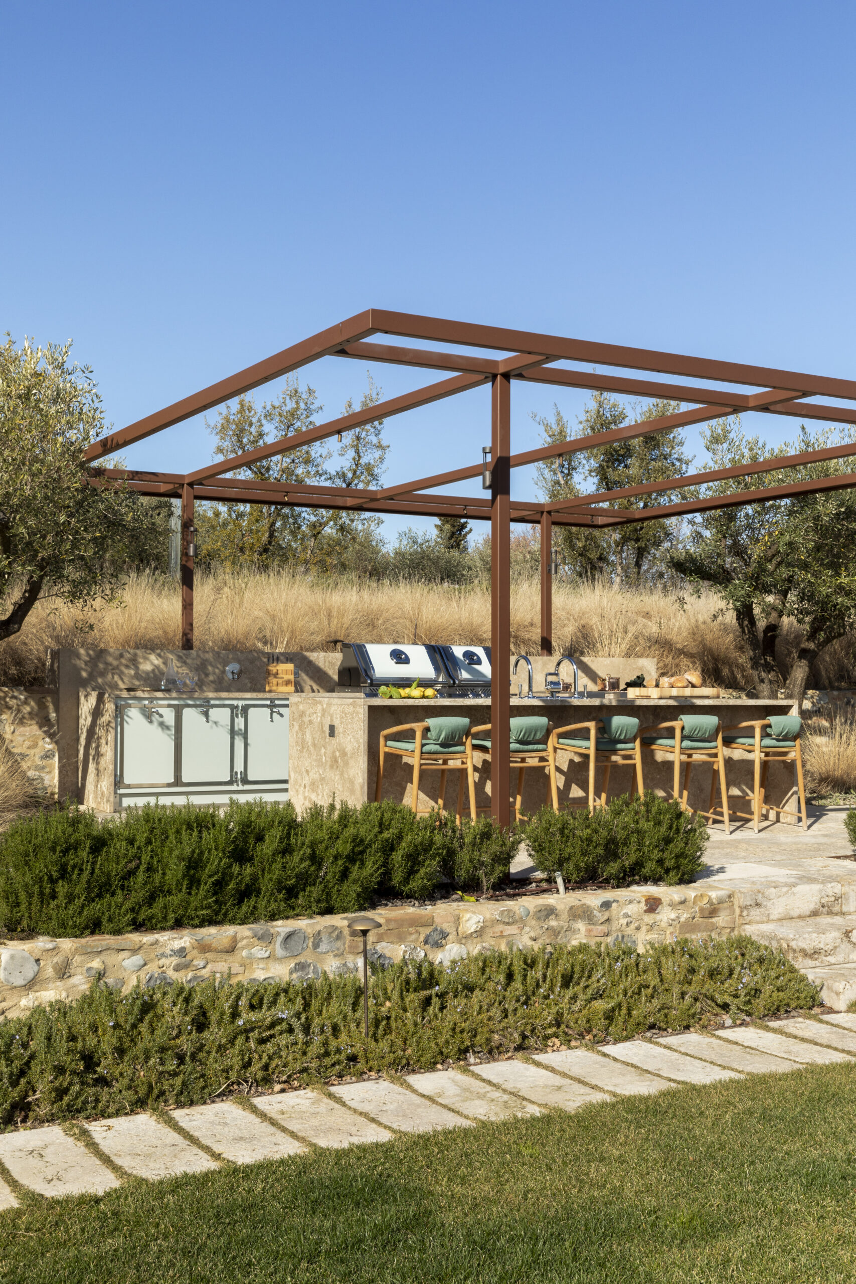 The layout combines a cooking area featuring double barbecues and sizzle zone burners with a central island equipped with an integrated sink and a cantilevered countertop with stools. A kitchen that brings together advanced technology, professional performance, and refined elegance, perfectly attuned to the Tuscan landscape.