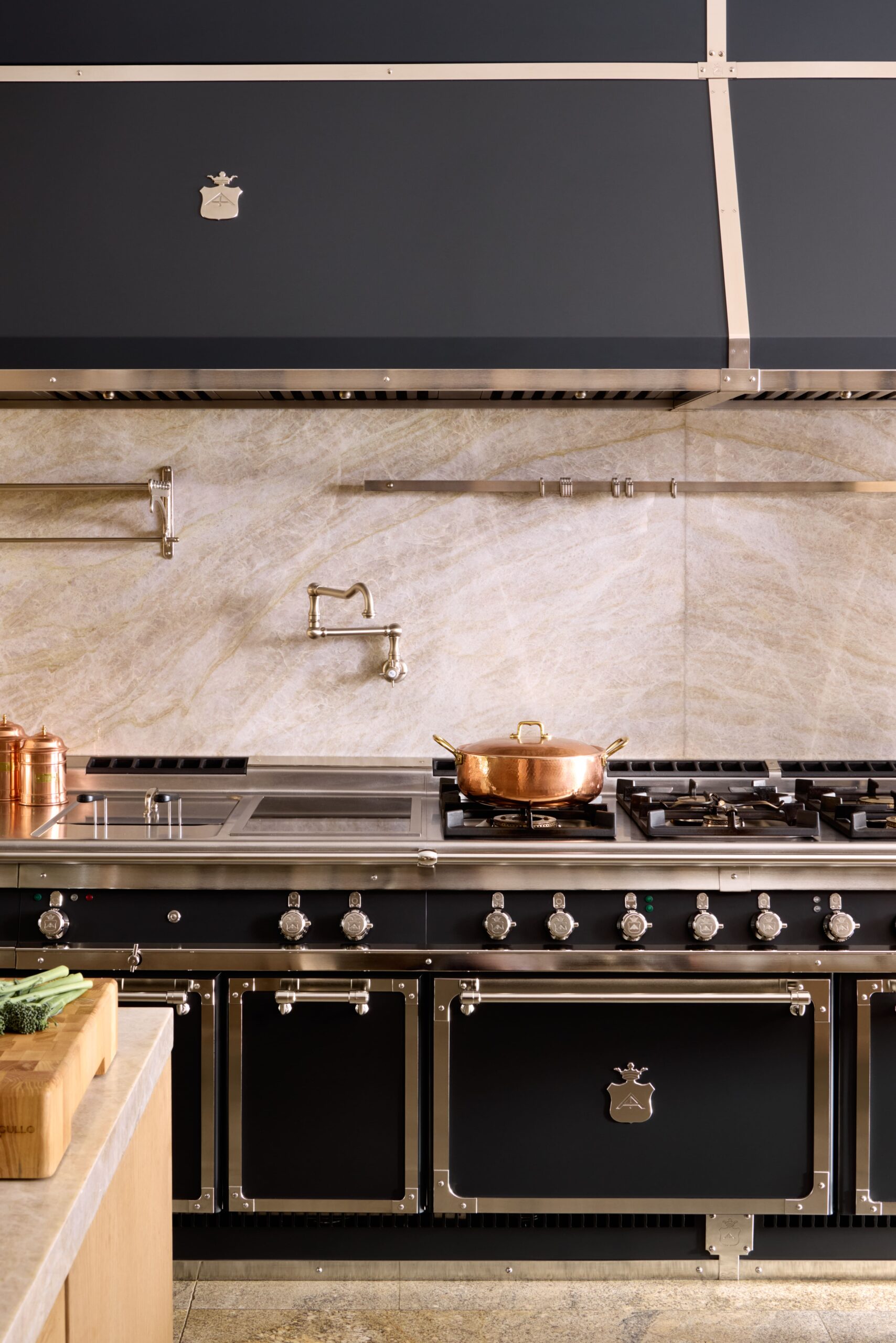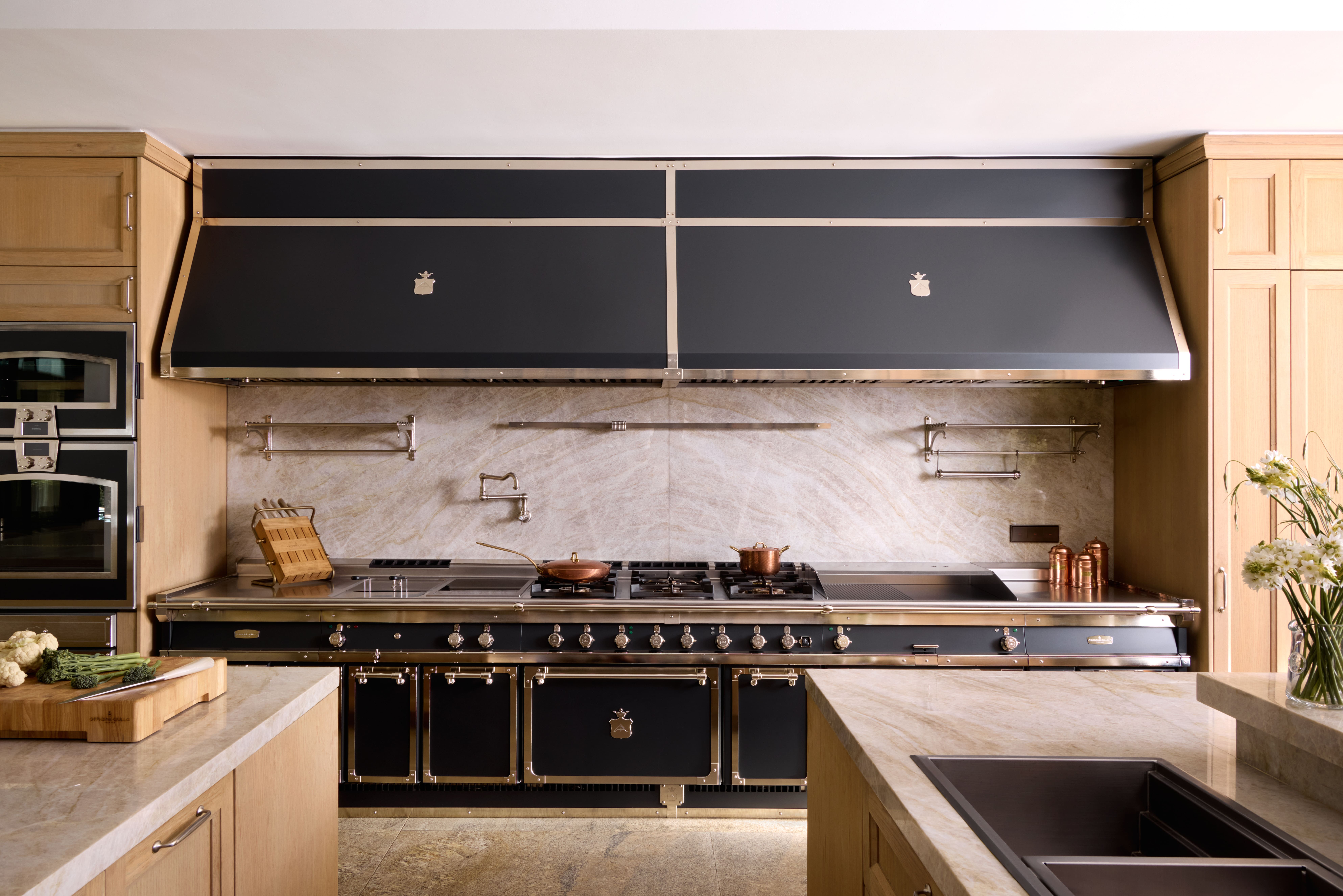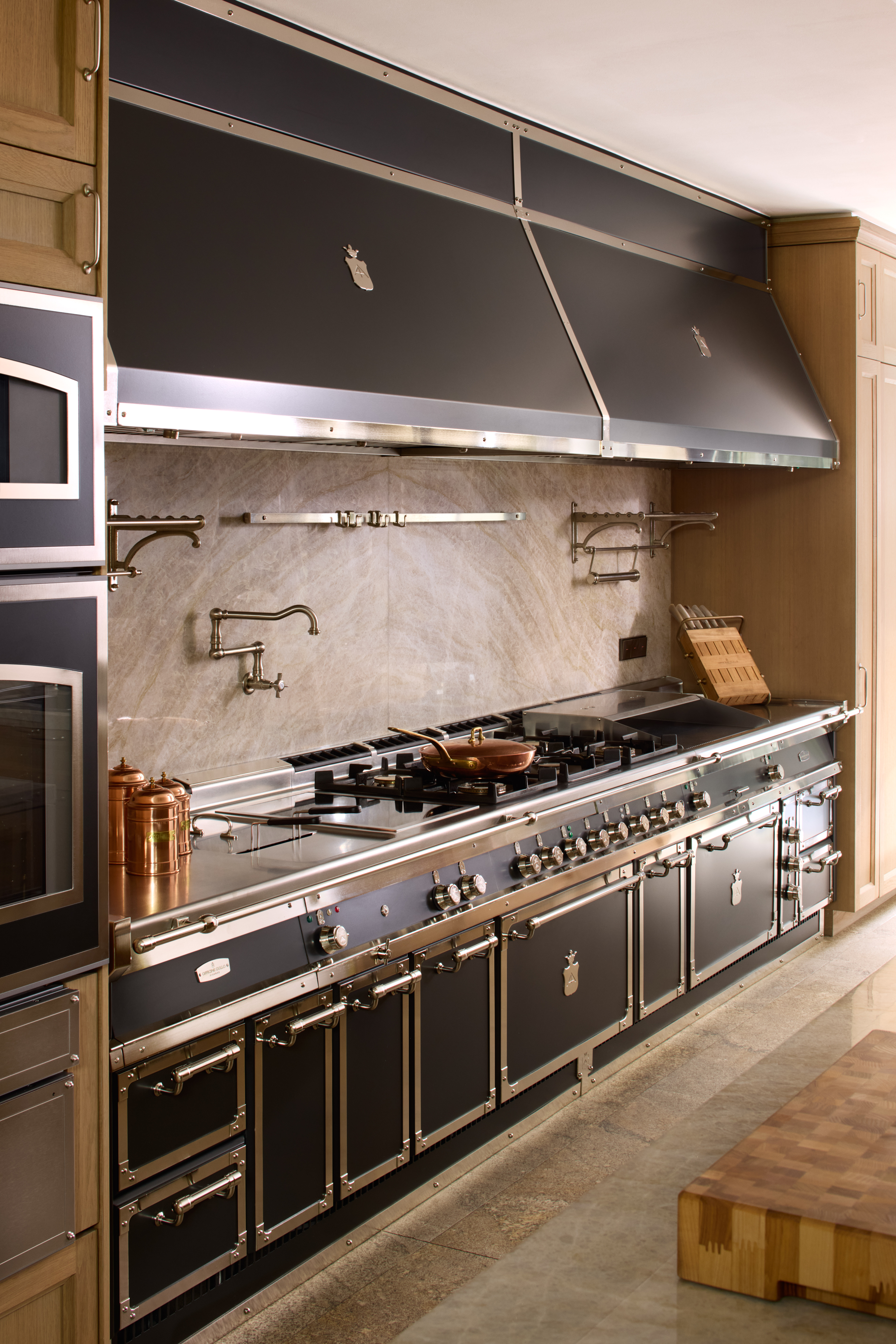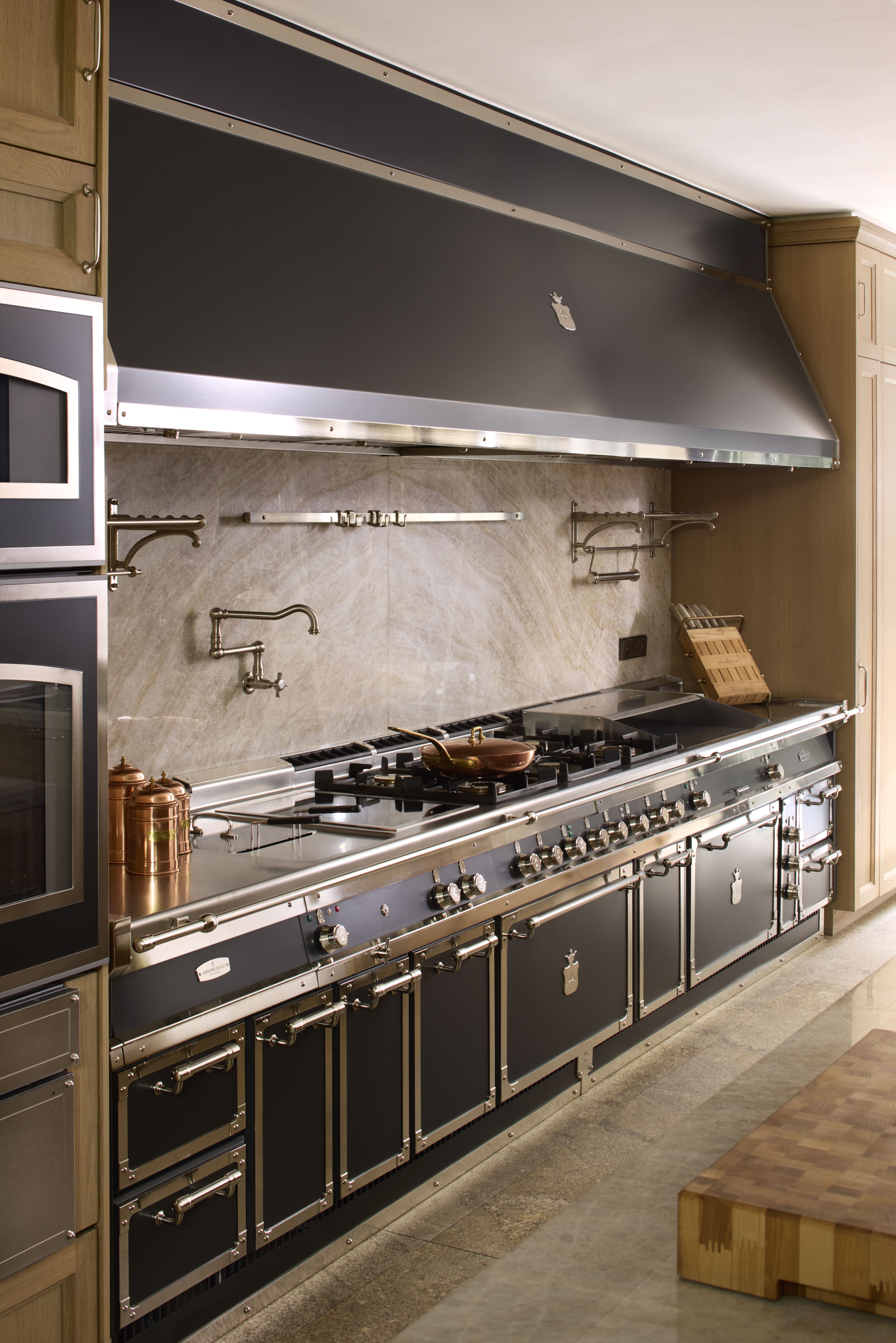 Le mur principal accueille une station de cuisson entièrement équipée: cuiseur à pâtes électrique, table à induction Gaggenau, six brûleurs à gaz, frytop combiné, vastes plans de travail, ainsi que fours statique et multifonction. Une hotte sur mesure, aux lignes nettes et affirmées, surplombe la composition, soulignant son caractère professionnel.