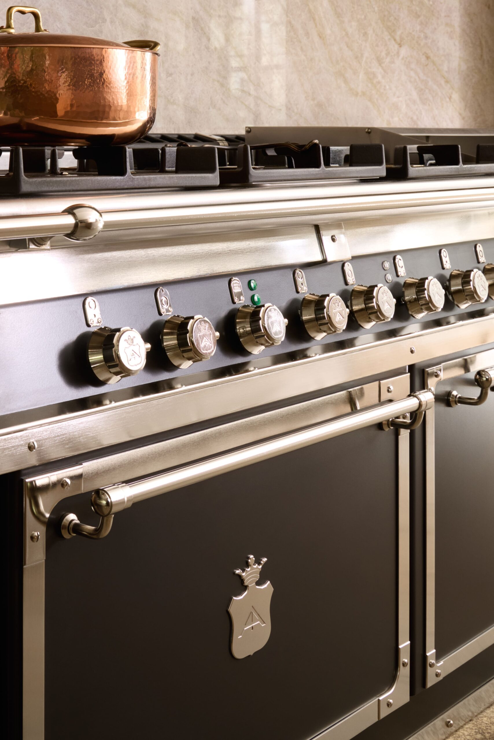 Finition Basalte mat; détails en nickel satiné; plans de travail en acier inox professionnel.