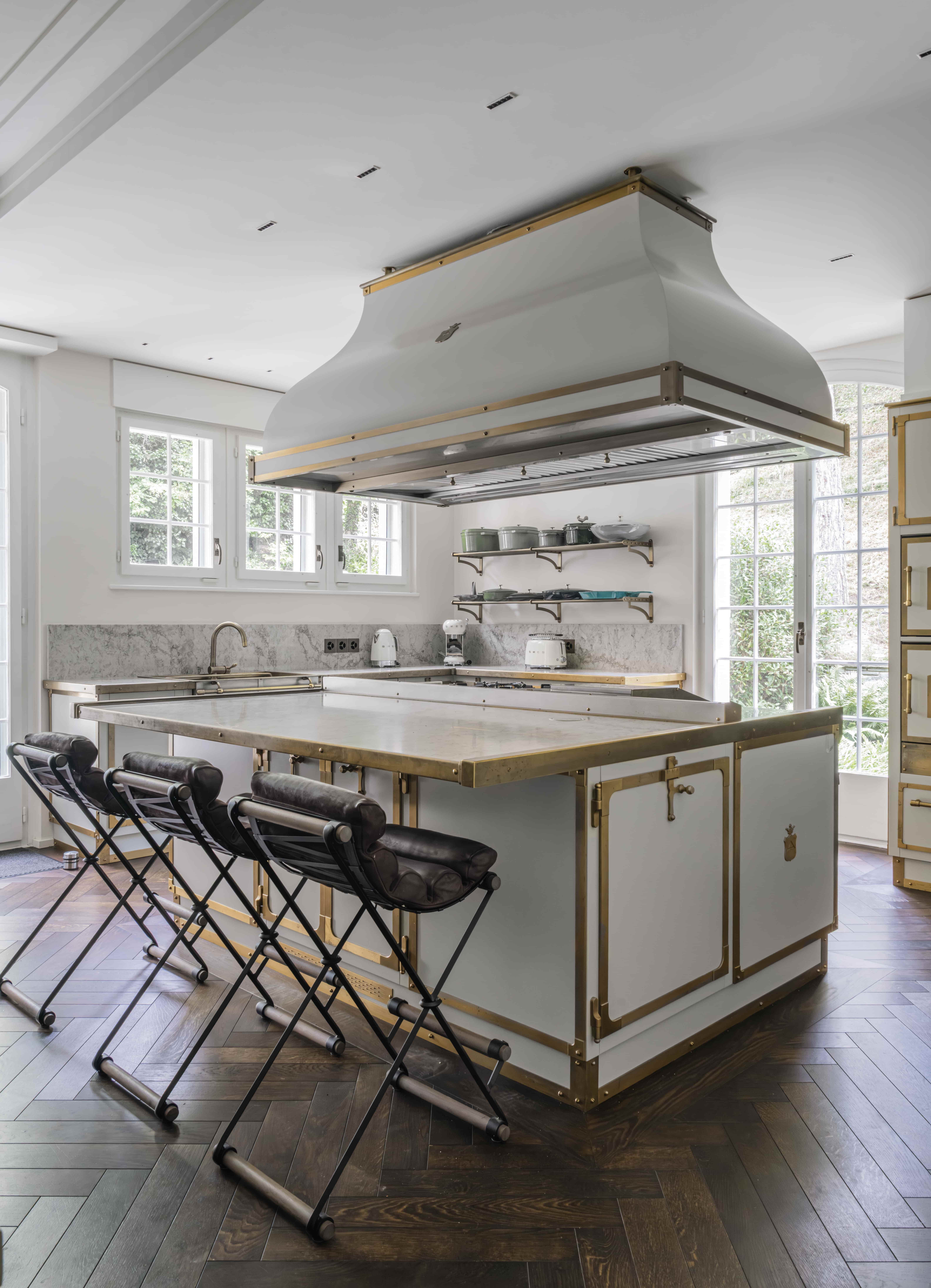 Structure en acier peint blanc; détails en laiton bruni; plan de travail en marbre;hotte professionalle en cloche; configuration de niveau professionnel dans l’ensemble.