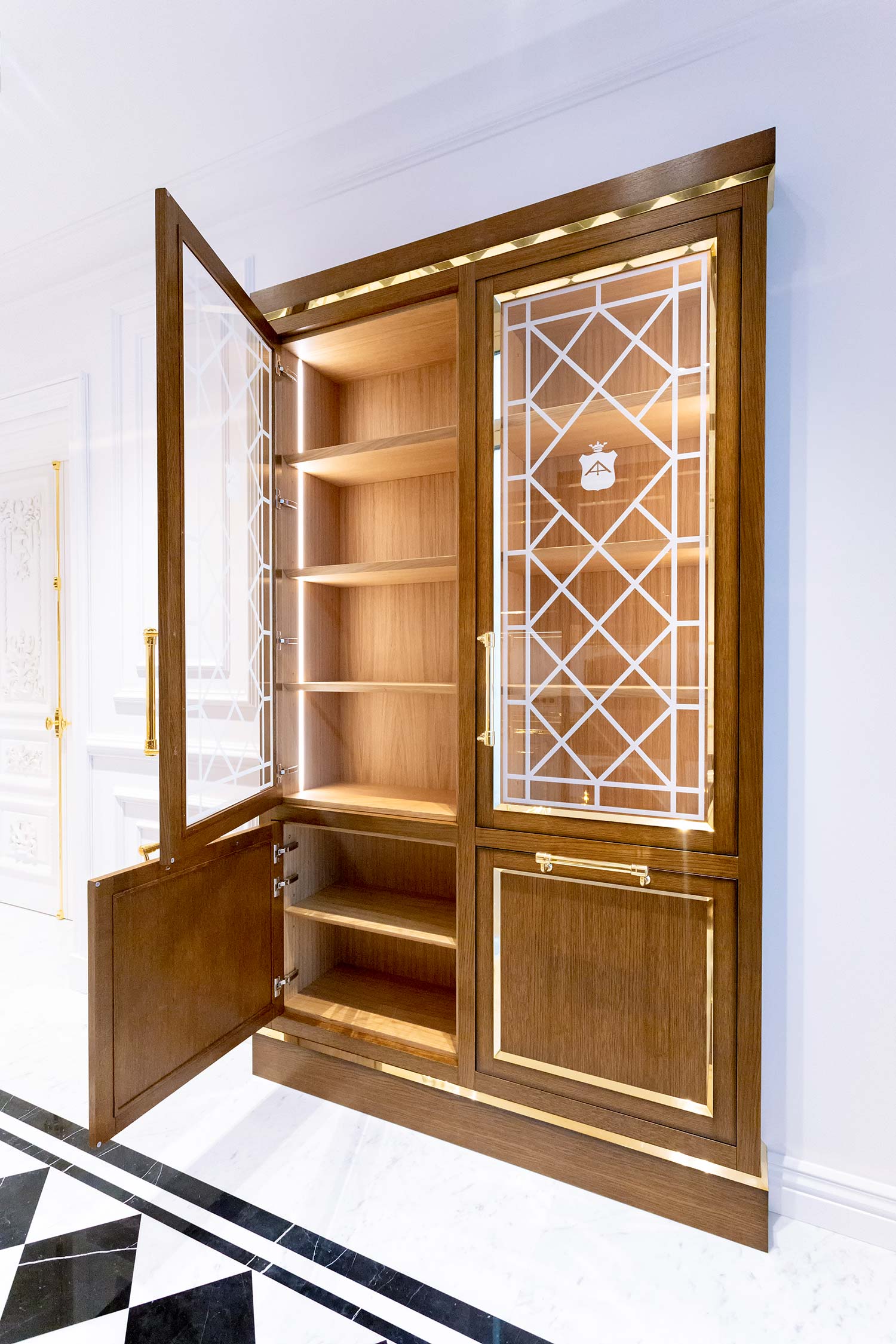 A long, front, lustrous brass rail runs the entire length of the kitchen, whose upper section consists of a polished steel work surface with welded washbasin and an induction stove, while the lower section features several drawers, storage space, a dishwasher and an oven. Four painted metal pediments vaunting polished brass cornices run along the cooking section. The Florentine fleur-de-lis graces the central pediment. Equipped with built-in LED lighting, an impressive pyramid extraction hood stands above the counter alongside two dark oak joinery elements. A multifunction oven, steam oven, microwave oven and dish-warming drawer are situated next to the metal kitchen, nestled in two joinery columns.