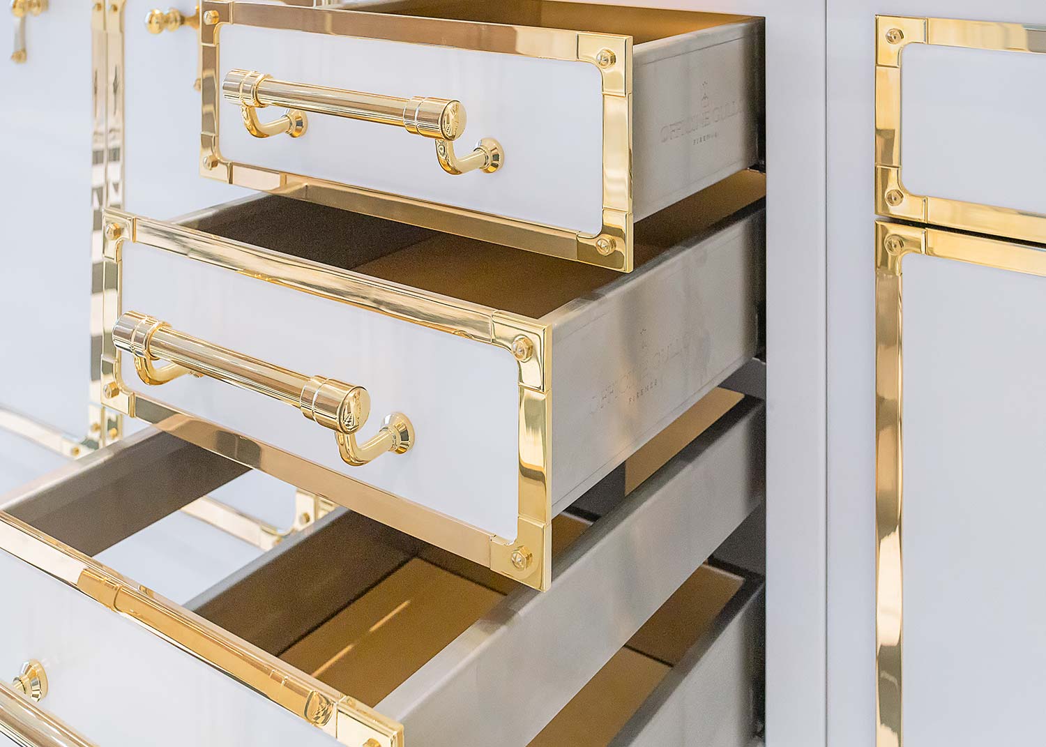 A carpentry wall with two built-in refrigerators and a display cabinet complete the kitchen. The cabinet is enhanced with decorations, internal lighting and polished brass finishes. Like all Officine Gullo creations, the composition of every project can be fully personalized, including the dimensions and the cooking section configuration, and even engraving on the handles and the colours. Each detail is a product of research and artisanal expertise. The cooking appliances are perfectly in line with a top-range professional kitchen.