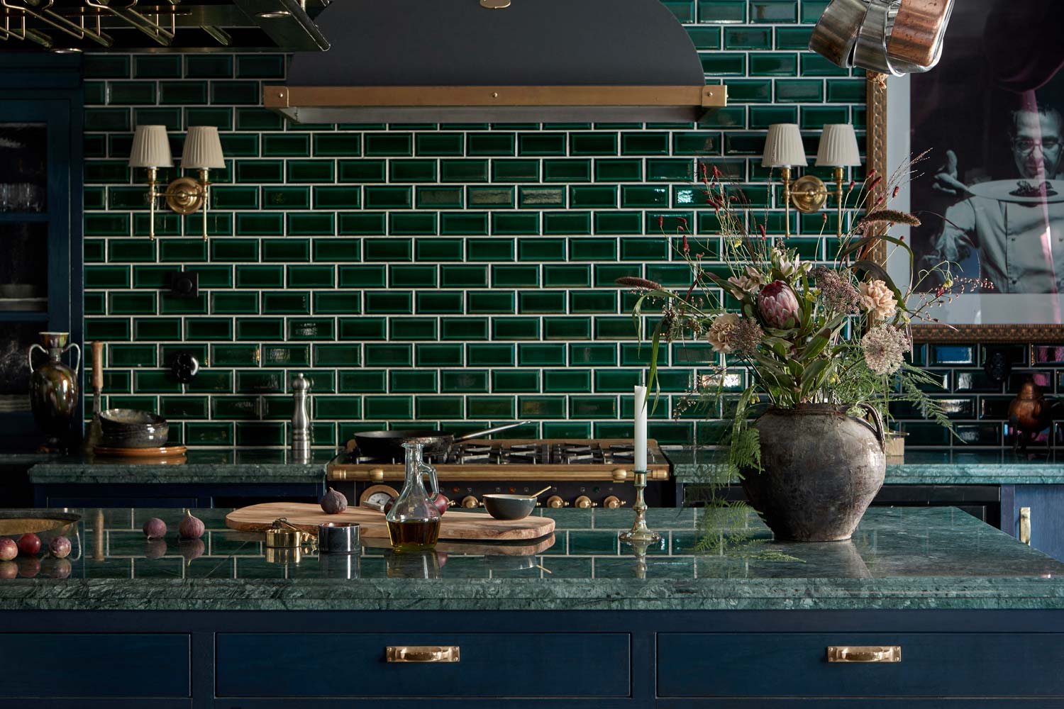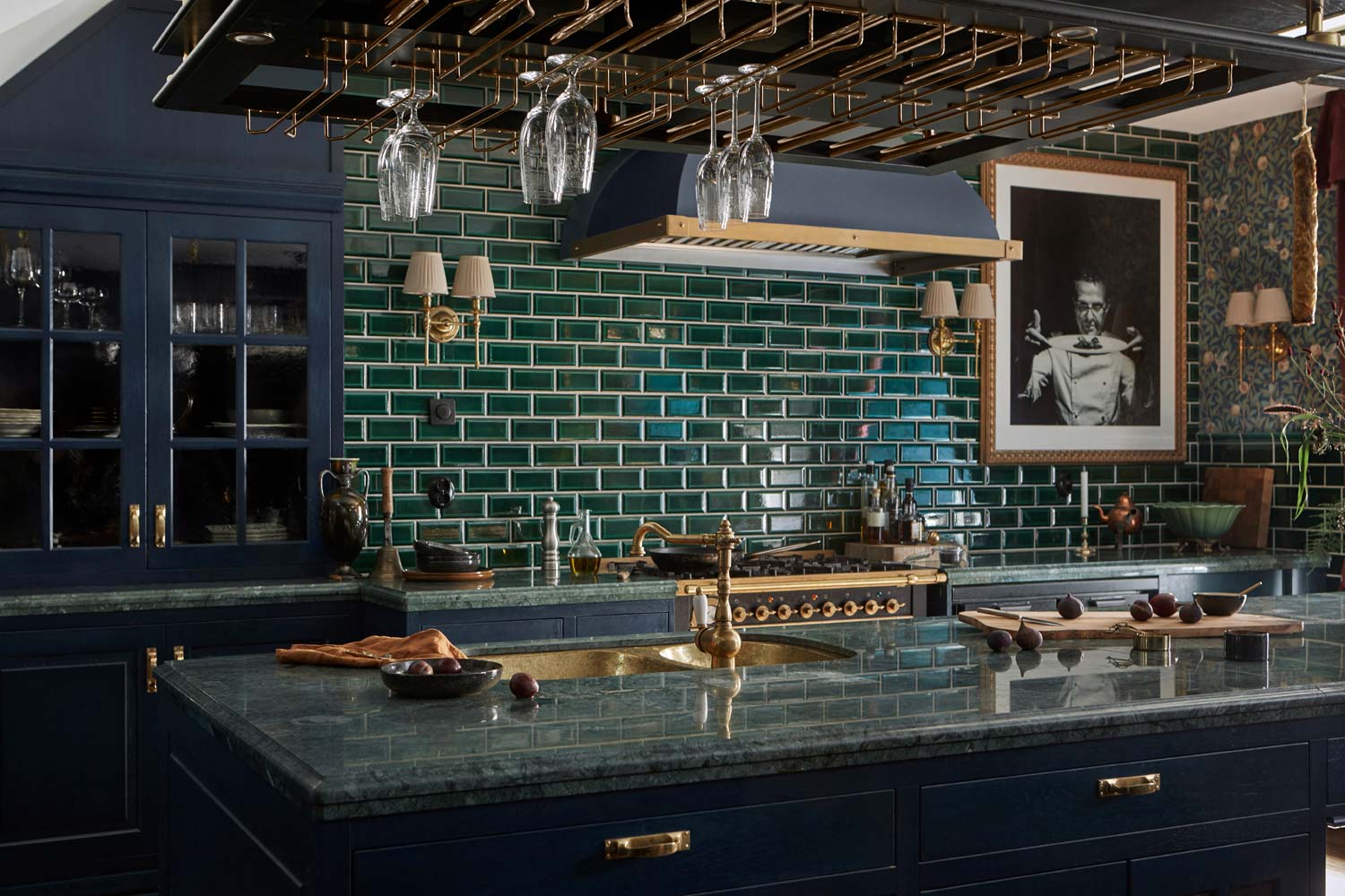 In the luxurious and elegant Pigalle boutique hotel in Gothenburg, Sweden, Officine Gullo has installed a cooking range from its Restart collection. The range, based on research into the design and furnishings of old Florentine villas, fits perfectly with Himlekok’s eclectic and elegant design. Like the Restart cooking range, the kitchen fixtures derive from craftsmanship. The cooktop and island are entirely handcrafted in oak, painted in Ultramarine Blue (RAL 5002) with burnished brass details, and in Guatemala Green Indian marble for the surfaces.