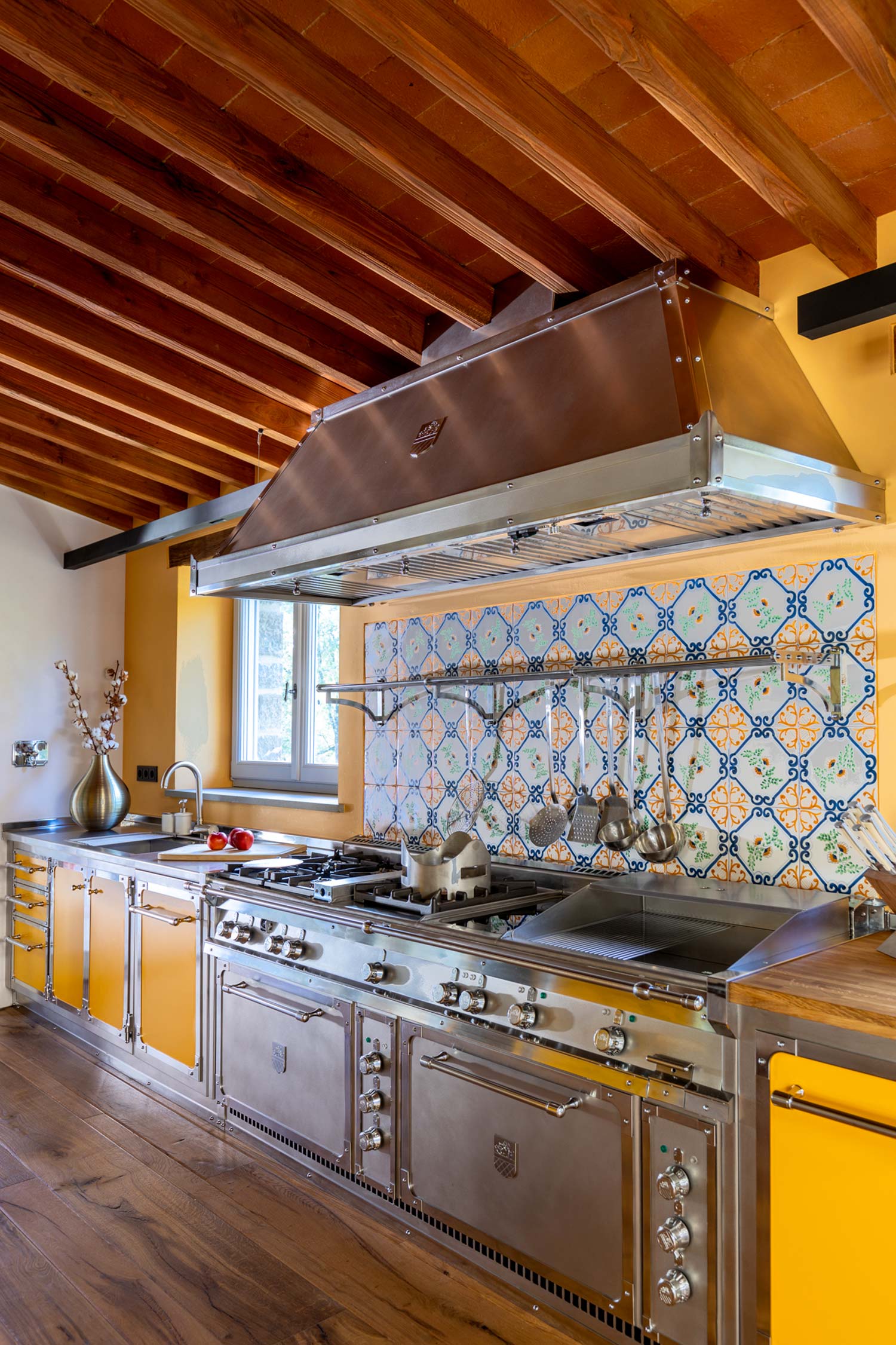 The cool tones of the steel cooking range and the chrome-plated brass of the finishes have been expertly paired with the warmer hues of the straw yellow painted cabinetry. The result is a harmonious exercise in contrasting colors, accentuated by the natural light which shines in through an attractive arch window with views over the Tuscan countryside.
