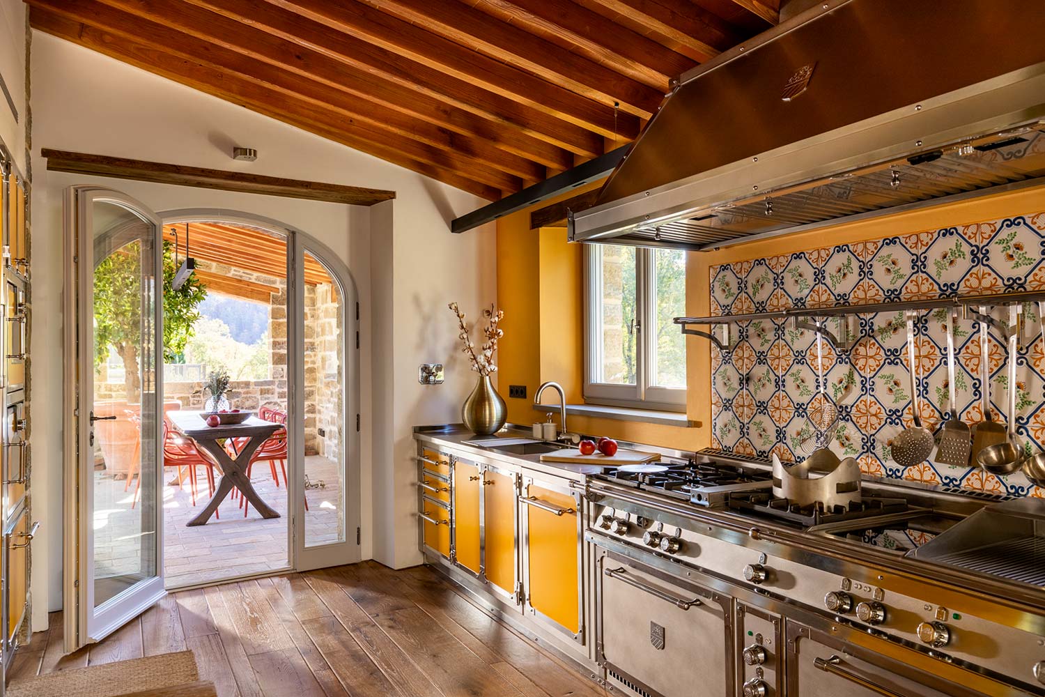 The entire estate, which stretches across approximately 100 hectares, fits into the typical Tuscan scenery of Chianti dotted with wooded hills, rivulets and fertile plains. In this bucolic setting, in addition to a top wine estate, the owners have renovated the old Pian Vecchio farmstead and the picturesque Castiglioni village, converting it into a luxury hospitality space. Officine Gullo has crafted a kitchen in the main residence, which vaunts a strong style and identity, blending the traditional charm of the centuries-old forms with up-to-the-minute, sophisticated kitchen technology.